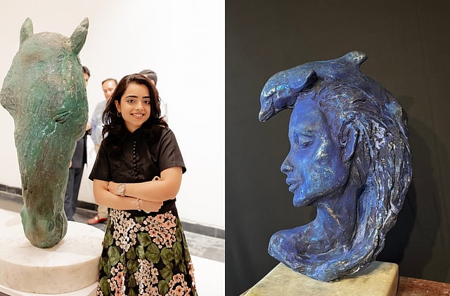 This layered training is evident across her work. Her equine sculptures combine anatomical precision with Indian and Middle Eastern motifs, rendered in vivid contemporary palettes. Portraiture, another cornerstone, captures individuality and emotion—poise, mischief, or contemplation.