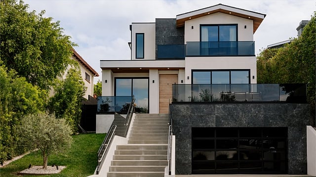 A floating staircase heads to all three levels of the 5,300-square-foot home.