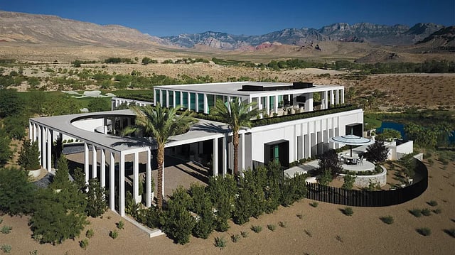With that starting point, Chenin began to imagine a modern, clean-lined residence with interiors that lean into the client’s aesthetic. “My style is very layered and eclectic,” she says. “I love mixing old and new, modern and classic. I needed that balance—something grand and elegant but also comfortable and livable.” The resulting 12,400-square-foot house (which also has a 3,200-square-foot subterranean garage) is simple in form—two large rectangles connected by a glassed-in atrium, with a large lounge and entertainment wing topping the east side, facing the Strip—but striking in appearance. Clad in bright-white travertine limestone, the structure stands in stark contrast to the soft browns and dark greens of the surrounding landscape, in a departure from the originally planned, darker finish. Hoover Dam–inspired columns run the perimeter; not merely ornamental, the fins were installed based on the sun’s angles to add shade and help absorb heat.