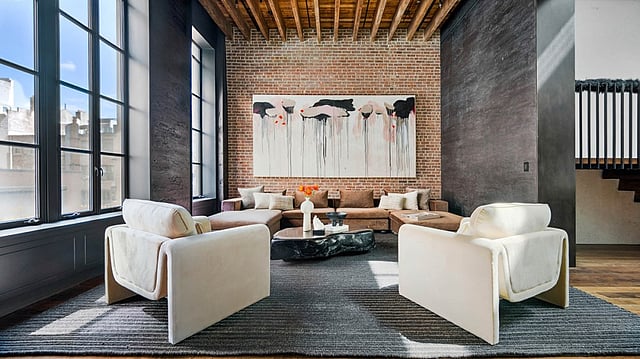 The main floor is located on the second floor and is accessible via the restored original staircase or a private elevator. Soaring 26-foot ceilings over the dining area are topped by skylights that flood the space with adjoining living room with natural light. Brick walls, exposed beams, and a wood-burning fireplace add to the ambience.