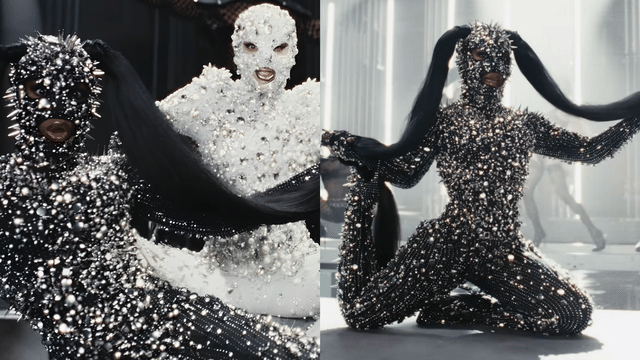 Lady Gaga wore a pearl-toned corseted bodysuit densely hand-embellished with crystals and pearls. Doechii wore a black version layered with spikes and metallic studs, with a base of sequins and crystals beneath the structured detailing. Both pieces were designed as seamless, head-to-toe silhouettes with integrated face coverings, functioning as what the label describes as a second skin. Each look took over 800 hours of craftsmanship and features more than 3,000 crystals, produced by a team of more than 20 artisans.
