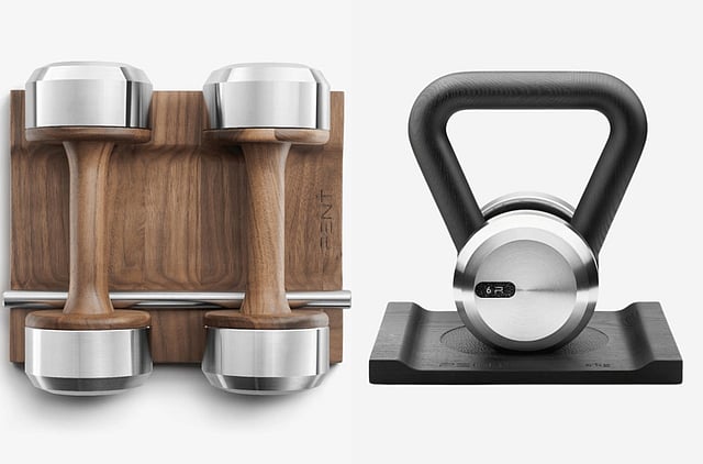 The dumbbells feature smooth wooden handles paired with stainless steel ends that are hand-held. The kettlebells are sculpted like statement décor pieces rather than standard gym tools. Even the storage racks are built with architectural precision so that the equipment becomes part of the interior design.