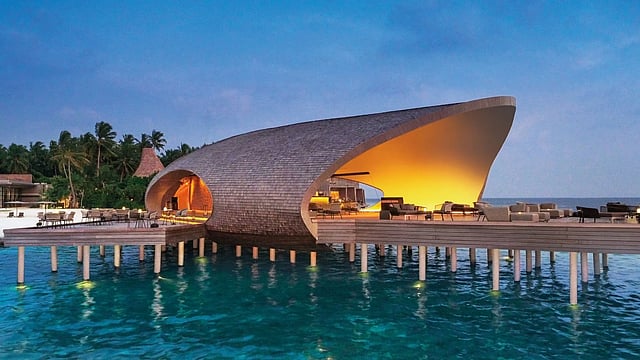 Guests arrive at the nine-hectare island, ringed by coral sand and surrounded by a house reef, by a seaplane from Malé. From the jetty, the paths lead through dense greenery to the resort’s marineand island-inspired structures. For instance, The Whale Bar, perched over water, takes its silhouette from a whale shark. The Iridium Spa, on the other hand, sits at the lagoon’s edge in a shell-shaped structure.