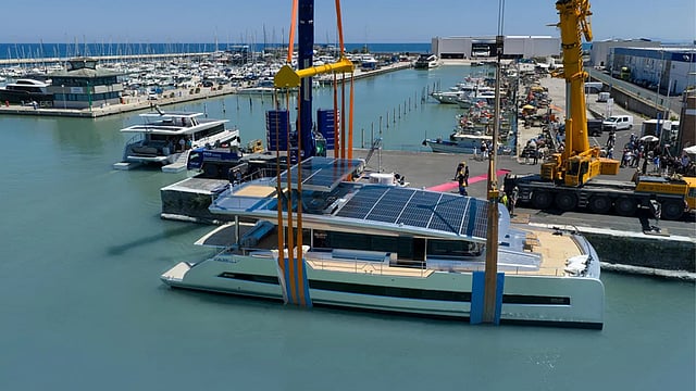 At the bleeding edge of sustainability, the cat is equipped with a solar array that can generate up to 22.4 kWp of clean power and a battery bank with a capacity of up to 696 kWh. It can traverse the seas near silently and without emissions at a cruising speed of between seven and eight knots and a top speed of 12 knots.